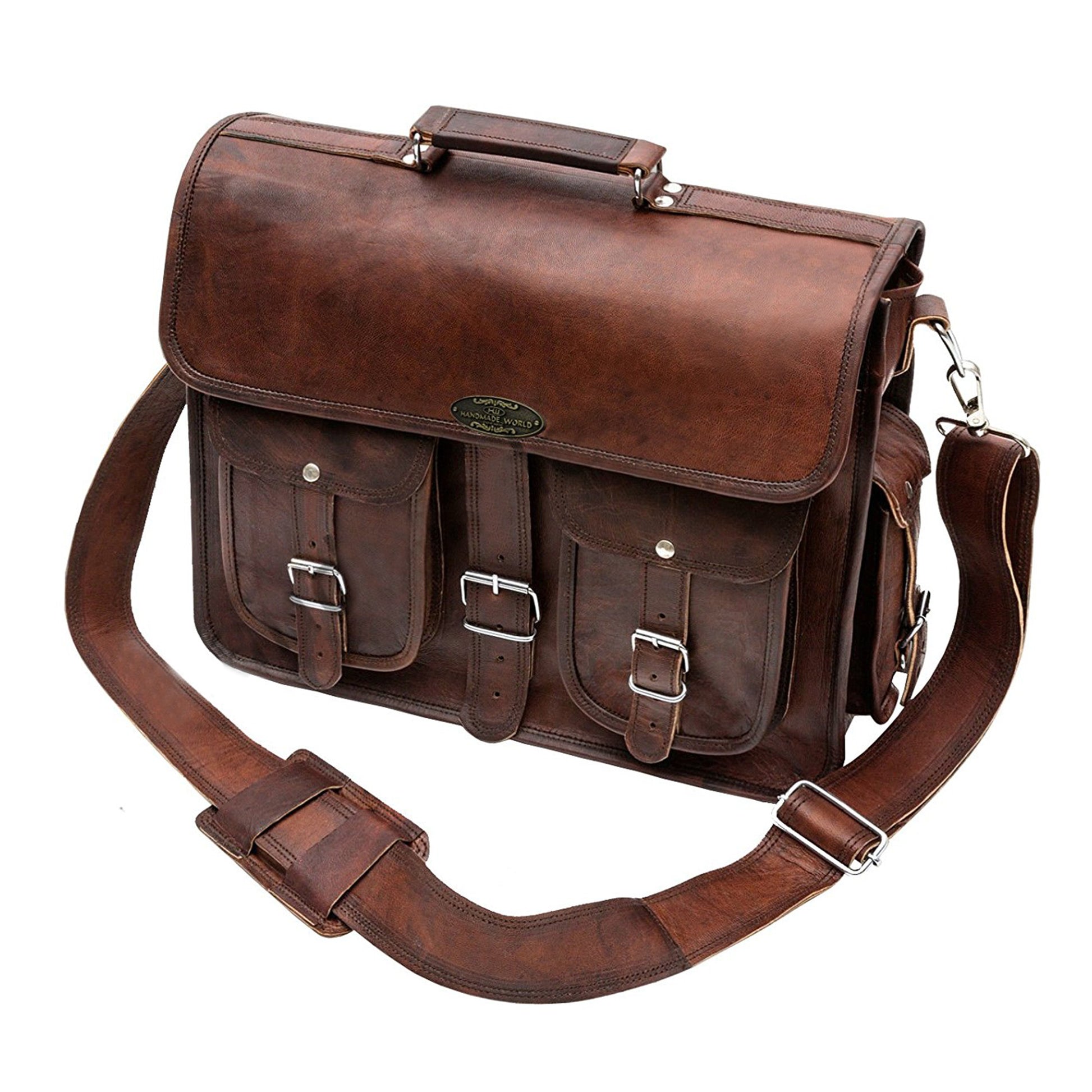 This vintage-looking rustic brown briefcase messenger bag is well-sized enough and holds all your office items with a great comfort. Its padded sections can accommodate laptops of up to 17 inches with files, documents, books etc. Also, it has plenty of room for your other essential stuff, making it easy for you to carry them without any worry and in a well-arranged way. The two external pockets are ideal for keeping keys, passports, bills, cables, etc. facilitate easy access, even in a crowded environment.