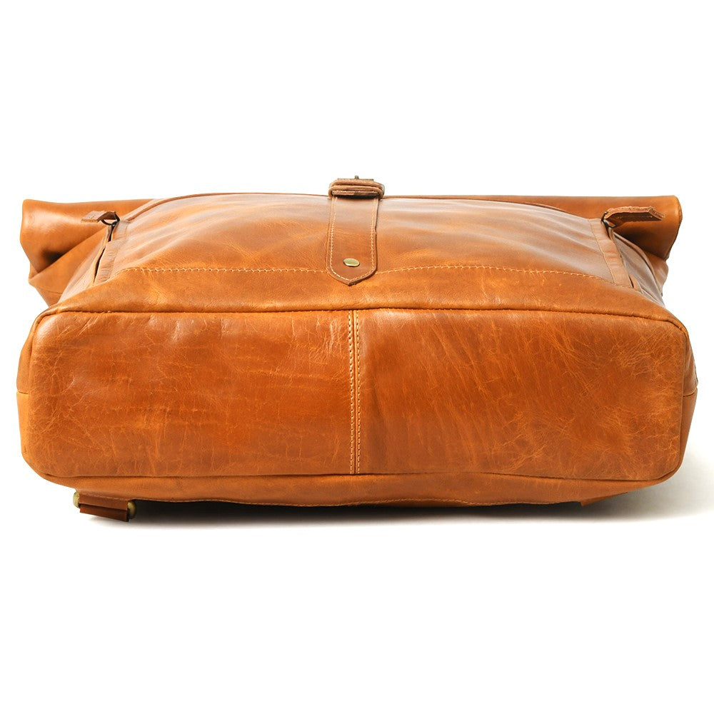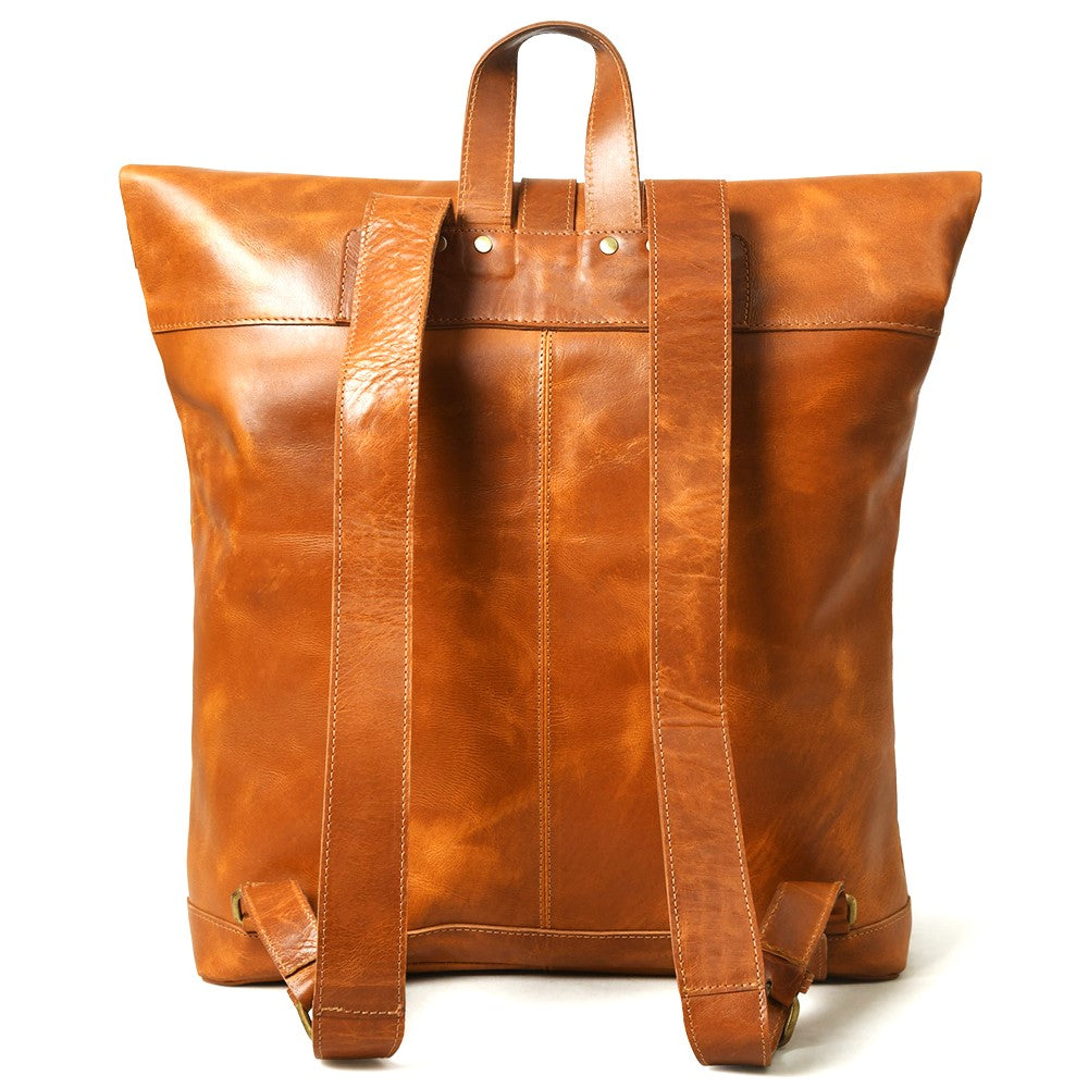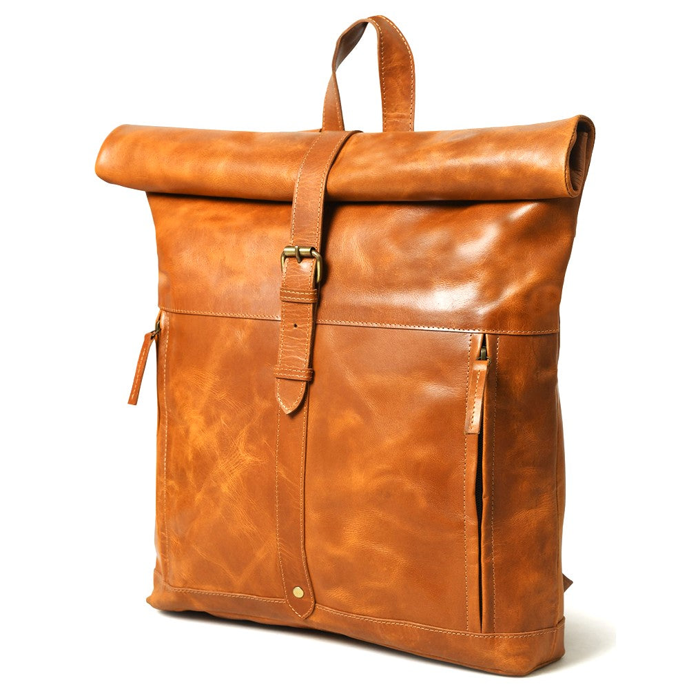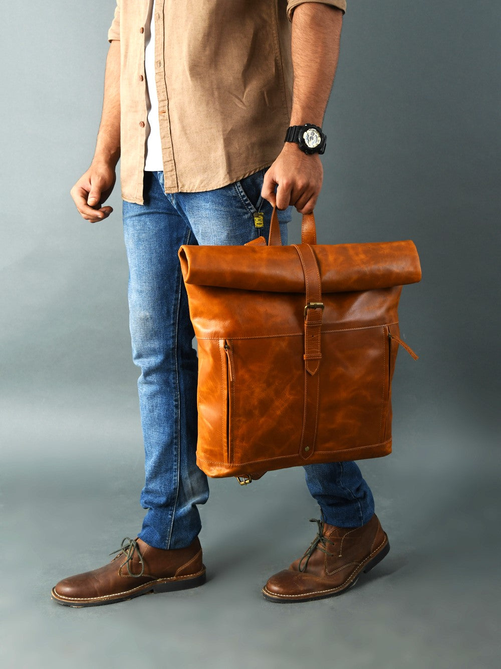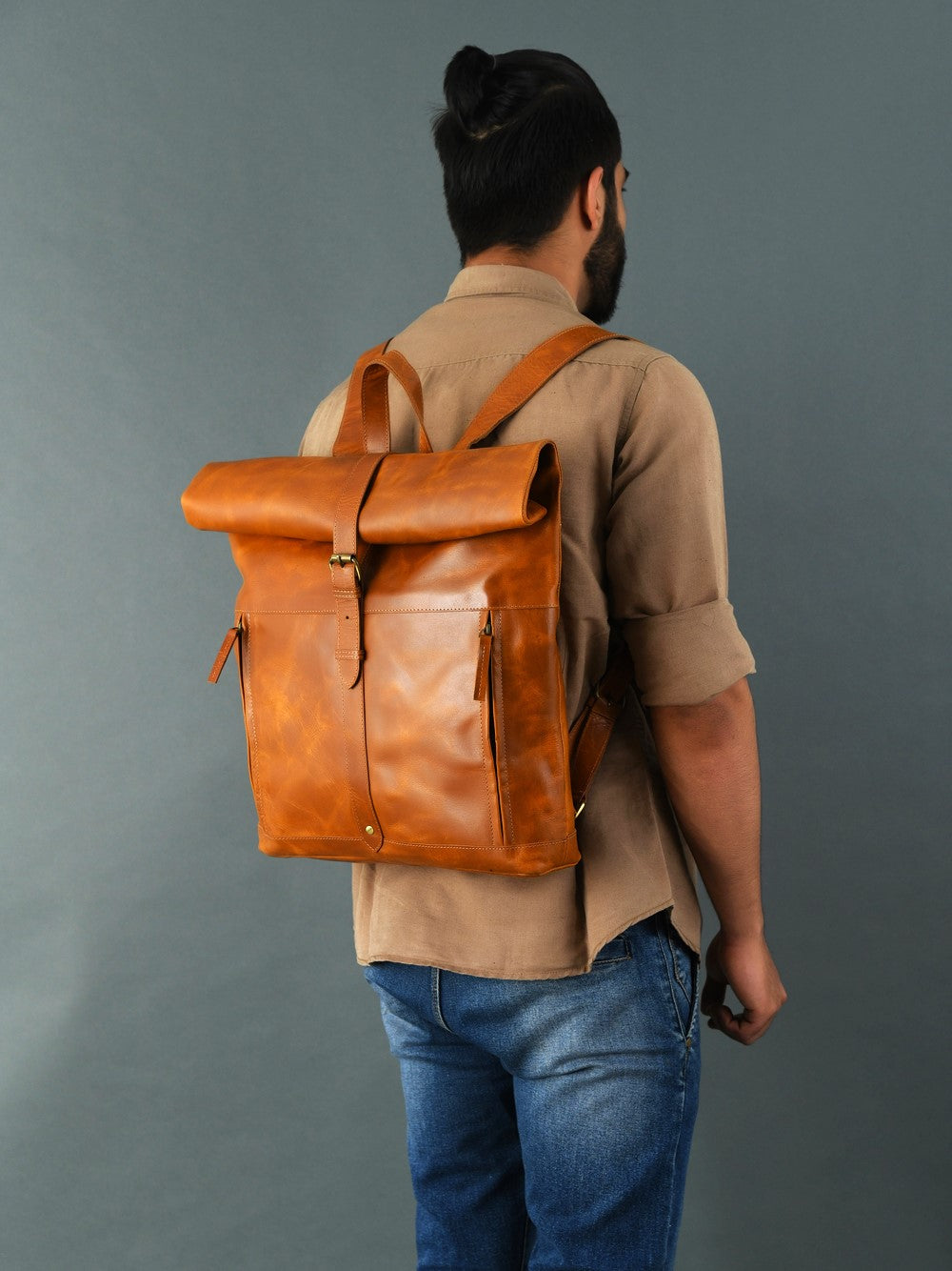 This tan leather backpack is a carry everything leather bookbag with 16" Height (Folded) X 14" Width X 4" Depth which allows to carry large laptops upto 18 inches as the height expands upto 22 inch when unrolled. 2 front zipper pockets and 1 internal pocket can be used to carry items that are frequently used and keep them safe as all the compartments with open wall pockets that stays secure under genuine leather drawstring closures.