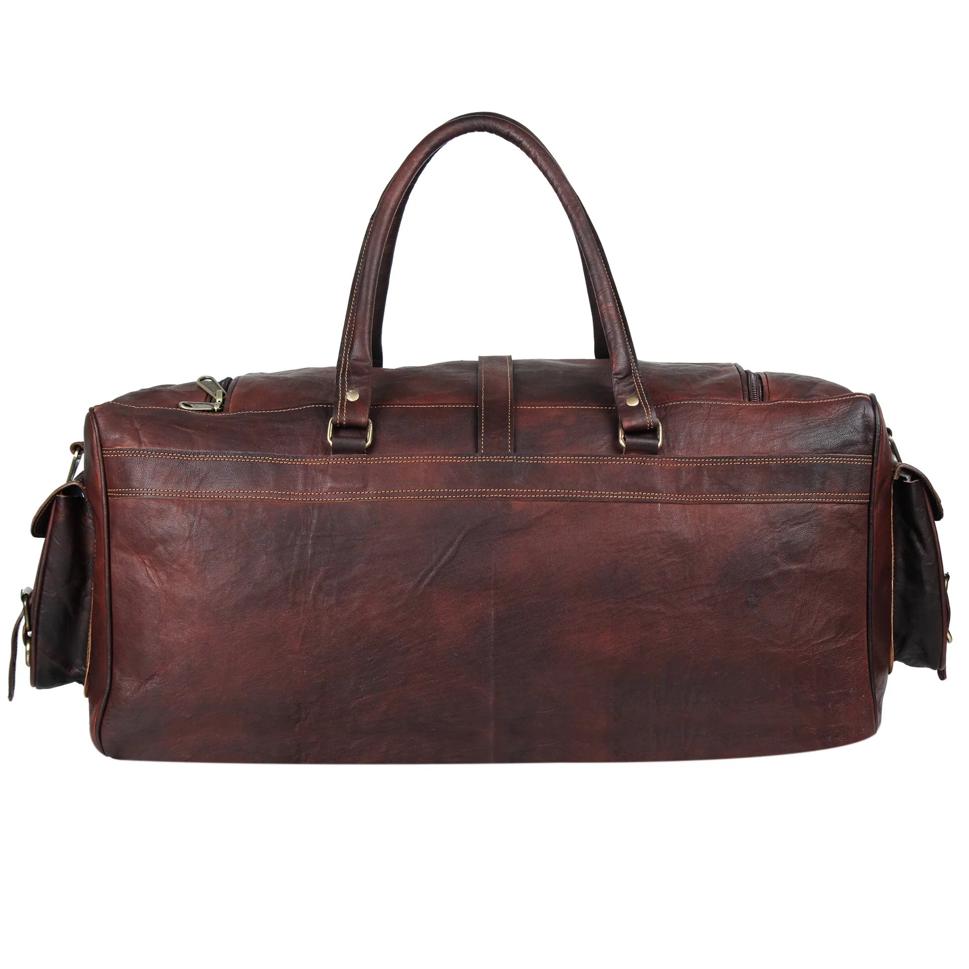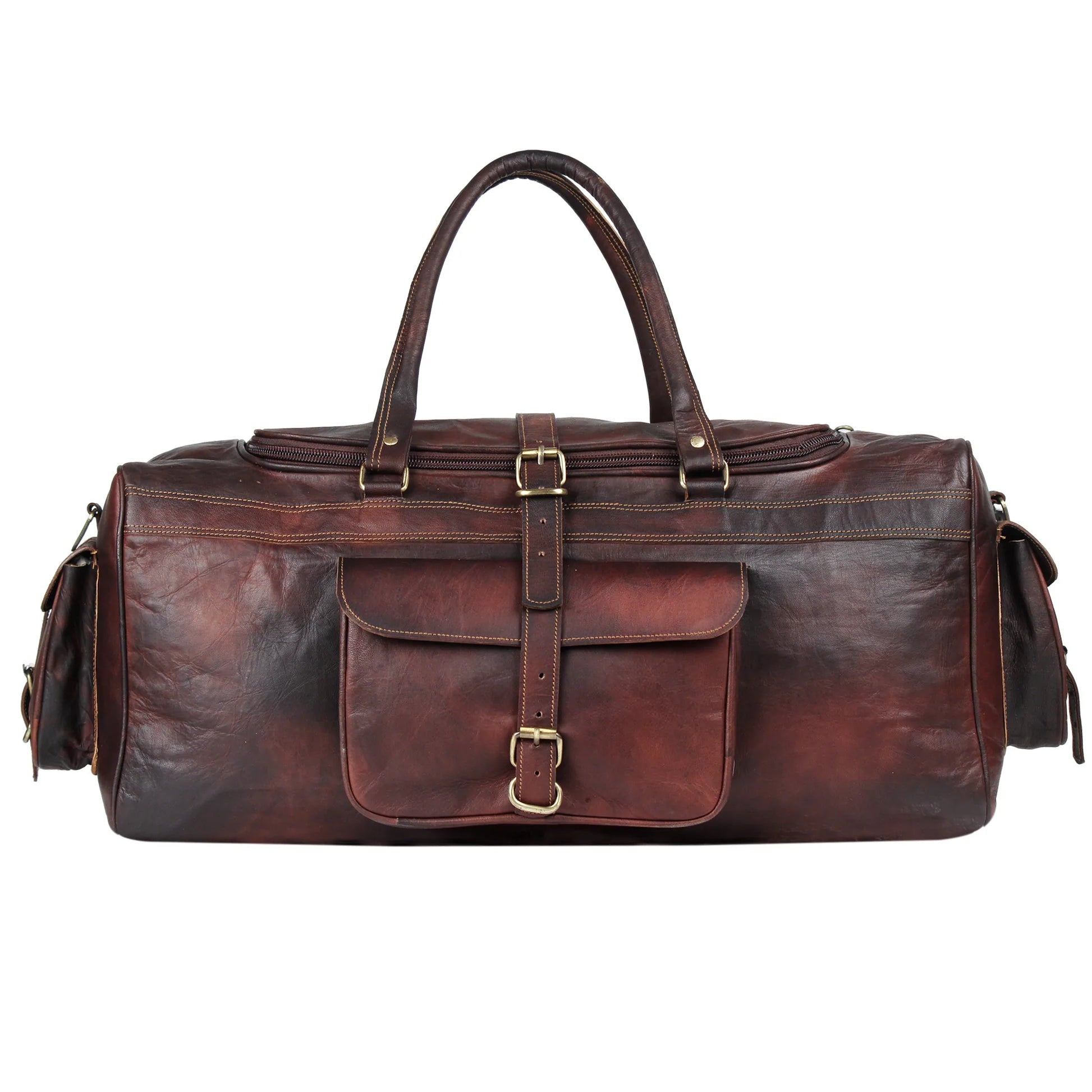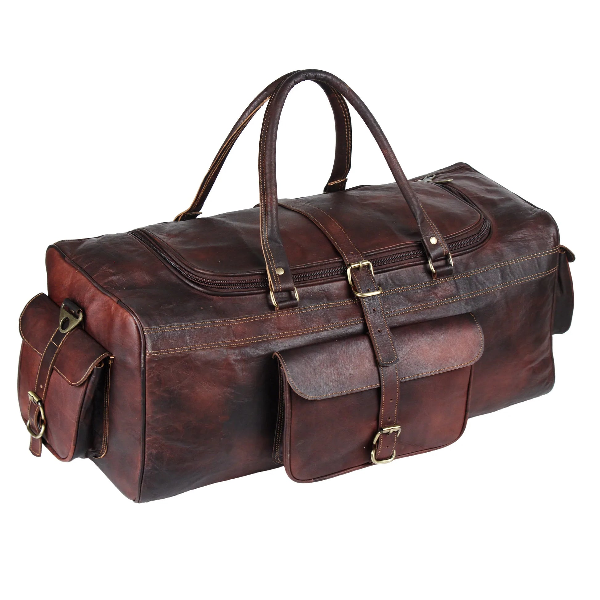 If you are a fan of that vintage classy look then this Vintage Red leather bag is perfect for you. The attractive design and look of this bag would add up style to your personality, this vintage color shade would complement all sorts of attires be it casuals or formals. This bag is diligently handcrafted by skilled craftsmen from India. It has square sides, one main compartment to accommodate your clothes, shoes, and other stuff, one big front pocket with a buckle, and two zippered side pockets. For ease of carrying, this Men’s Leather Duffle Bag comes with two handles accompanied by a detachable belt which makes it easy to carry wherever you go. This enhances the grip of the bag and helps in load sharing of this Vintage red Leather Bag.