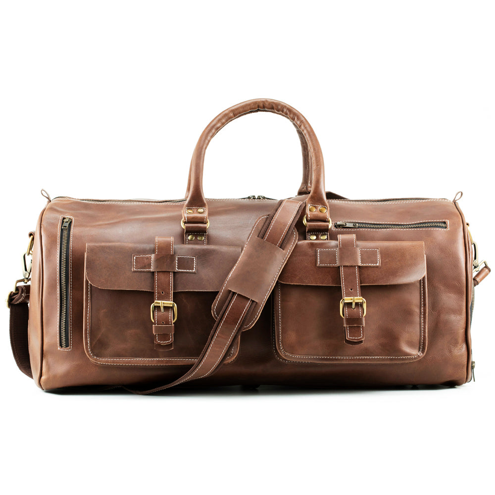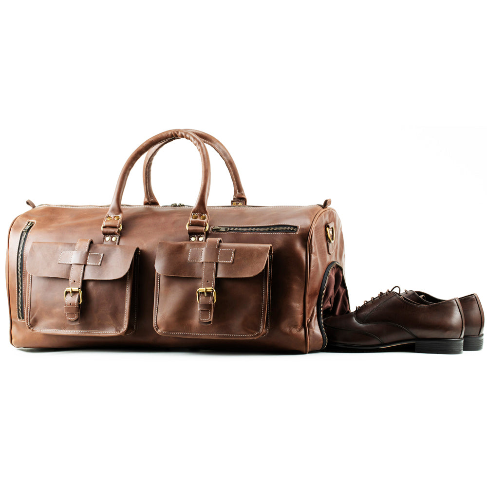 Our buffalo leather travel bag is designed to store all your accessories and you do not have to worry while carrying this bag in airlines. The dimension of this leather weekender bag is 24" Length X 10" Depth X 10" Height with 2 front big pockets and 2 small zipper pockets. The shoe compartment makes this bag more worthy. It has 1 internal zipper and 1 sleeve for laptop or other stuff to carry with padding. The adjustable strap with shoulder makes makes it more easy for travel.