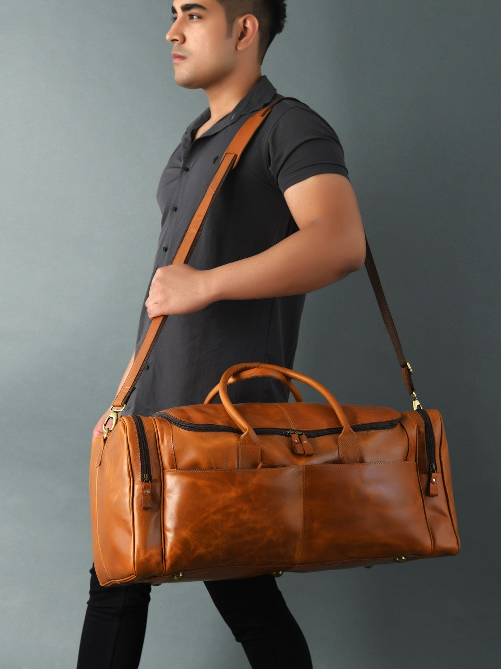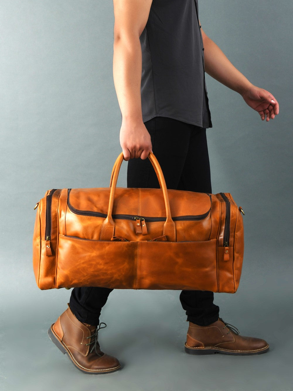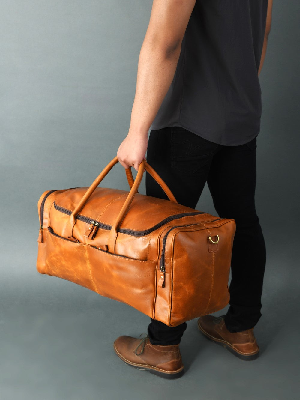 This tan leather duffle bag is made of 100% genuine buffalo leather which is durable partner for your travels or in professional life. With time the color, texture and character gets richer. A great carry on overnight bag is handcrafted by skilled artisans to lasts for years. Our leather luggage bag is perfect for weekend gateway plans with spacious, super stylish and functional to carry all your travel necessities.